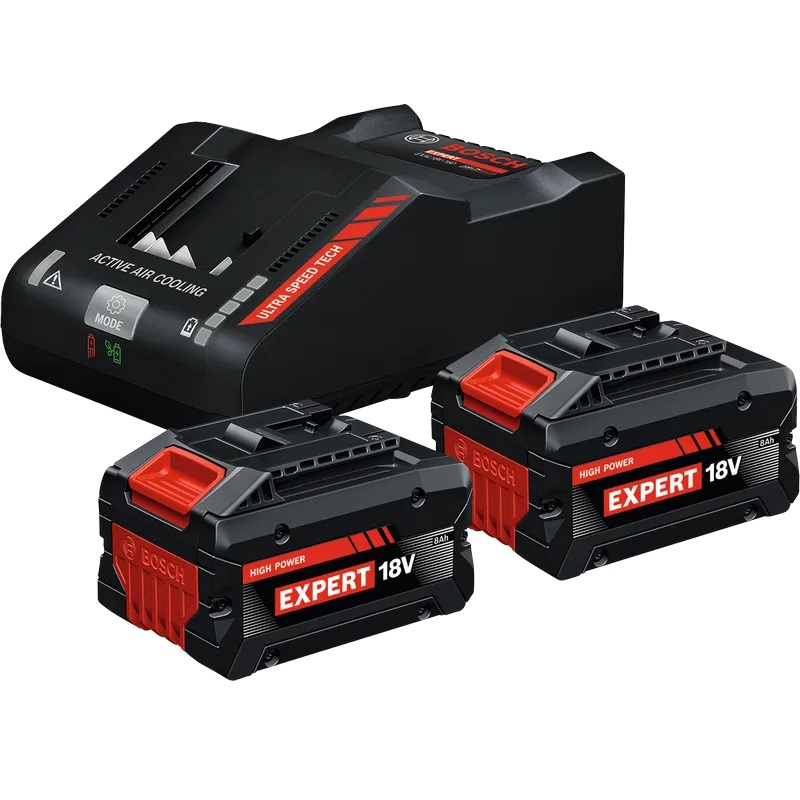 Bosch Expert akude ja laadija stardikomplektis on kaks 18V 8.0Ah akut ja kiirlaadija.