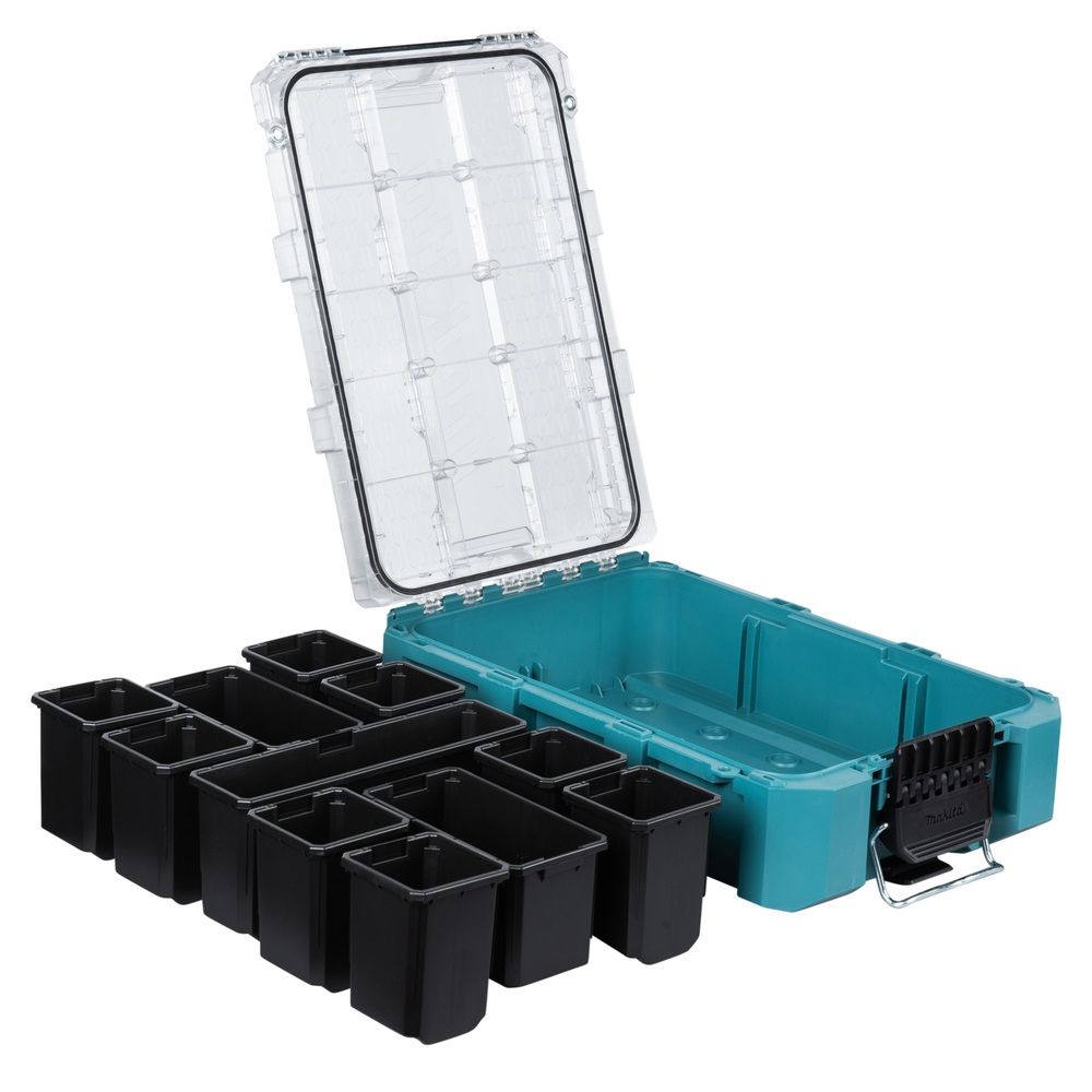 Keskmine sorteerimiskohver 18,4 L, Makita MAKTRAK® moodulkasti süsteemi osa. Läbipaistev kaas, et sisu oleks hästi nähtav, ja ribiline disain sisemiste topside paigalhoidmiseks. 11 eemaldatavat organiseerimistopsi mitmekülgseks hoiustamiseks. Ruumi optimeerimiseks saab topsid kokku panna. Suur kindasõbralik lukk ja vastupidav mugav kandekäepide. Metallist tugevdatud tabaluku aasad ja peidetud turvajälgija pesa.