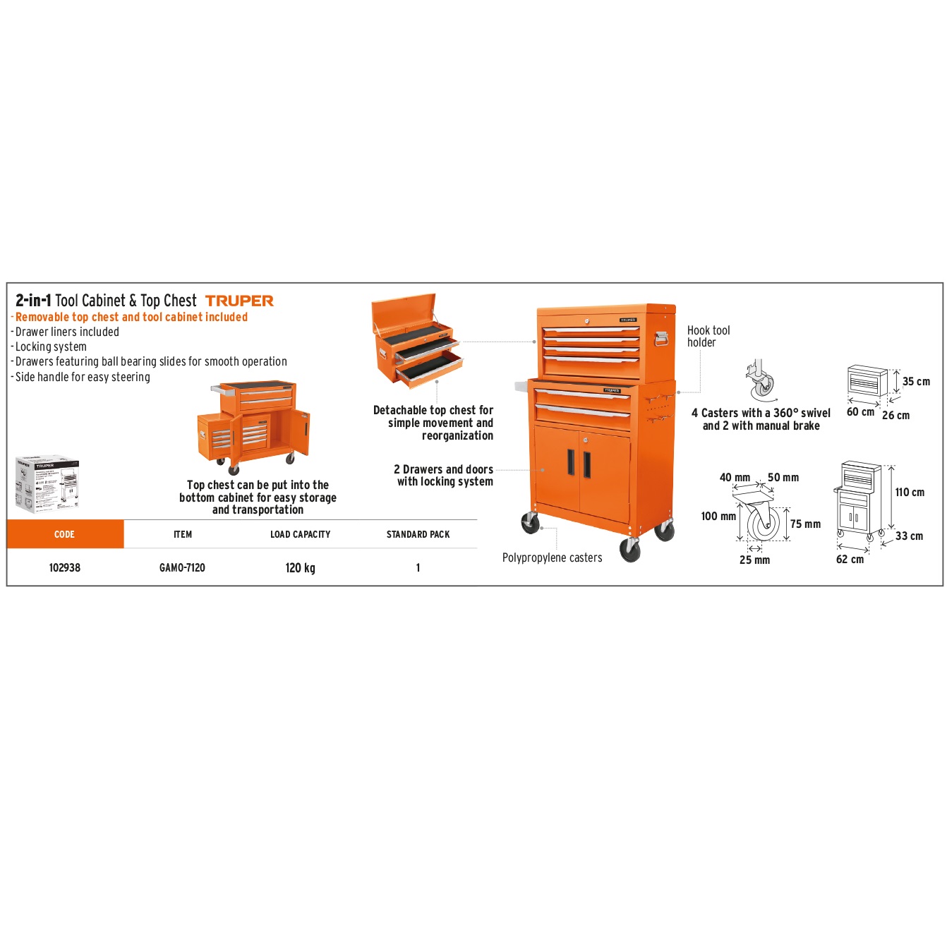Metallist tööriistakäru 6 sahtliga ja 2 sektsiooniga Truper. Ülemine osa on eemaldatav ja paigaldatav ka kappi sisse.