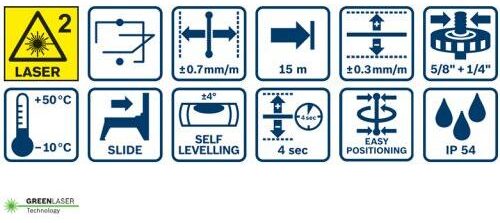 - Horisontaalsed ja vertikaalsed laserjooned ja kaks hästi nähtavat tsentreeritud loodimispunkti