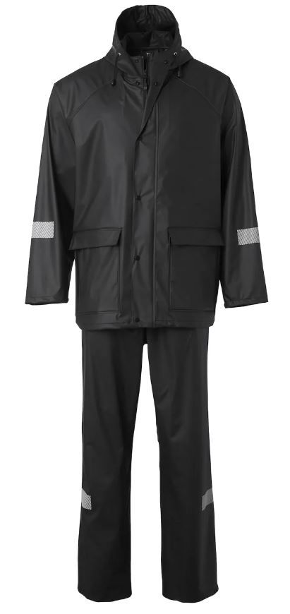 Vihmariiete komplekt helkurdetailidega: püksid + jakk. Jakil on reguleeritav kapuuts, mille saab krae sisse peita. Jakil kaks klapiga kaetud taskut. Lukk kaetud trukkidega kinnitatava tormiklapiga. Pükste vöökoht on elastne ja nööriga reguleeritav. Trukid jaki varrukate ja pükste säärte otstes. Vastupidav ja veniv materjal (PU-kattega polüester).